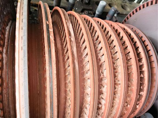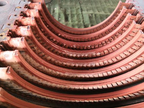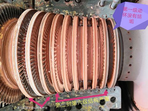 由于鍋爐產(chǎn)出的蒸汽并不是絕對的清潔(其中含有各種鹽分和雜質(zhì)),蒸汽在進(jìn)人汽輪機(jī)內(nèi)膨脹做功時,參數(shù)降低,攜帶鹽分的能力逐漸減弱,鹽分即被分離出來,緊緊地黏附在噴嘴、動葉和汽閥等通流部分的表面上,形成一層堅(jiān)硬的鹽垢。汽輪機(jī)內(nèi)沉積的物質(zhì)可分為易溶于水的、稍溶于水的和完全不溶于水的。可溶性的均是鈉鹽,如碳酸鈉、硫酸鈉、硅酸鈉、氯化鈉、磷酸三鈉等;不溶性的是二氧化硅、氧化銅、三氧化二鐵等。
